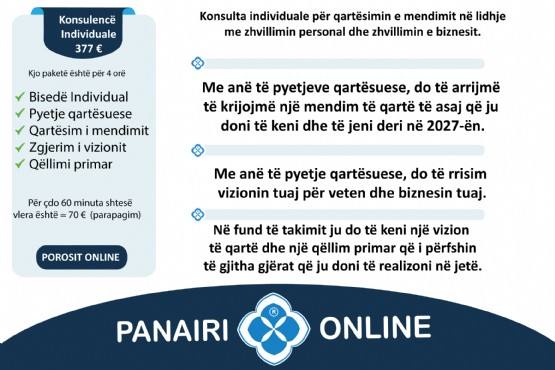 Konsulencë individuale me Z.Muhamet Bizhga CEO & Founder @Panairi Online SHPK dhe autor i 4 librave për zhvillim personal, për qartësimin e mendimit në lidhje me zhvillimin personal dhe zhvillimin e biznesit.